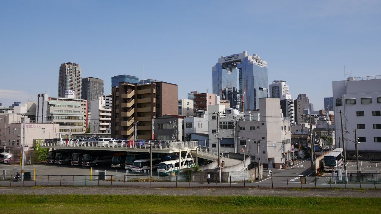 この特徴ある建物は梅田スカイビルですが、JR大阪からすぐ近くに見えるのですが、梅田北ヤードと呼ばれるJR貨物駅跡が間にあります。(Google Mapで見るとJR貨物駅である事がよくわかります)将来再開発が進めば近くなると思うのですが今のところは遠回りしなければなりません。歩いて行けない距離ではないですが、特に夏場は注意してください。